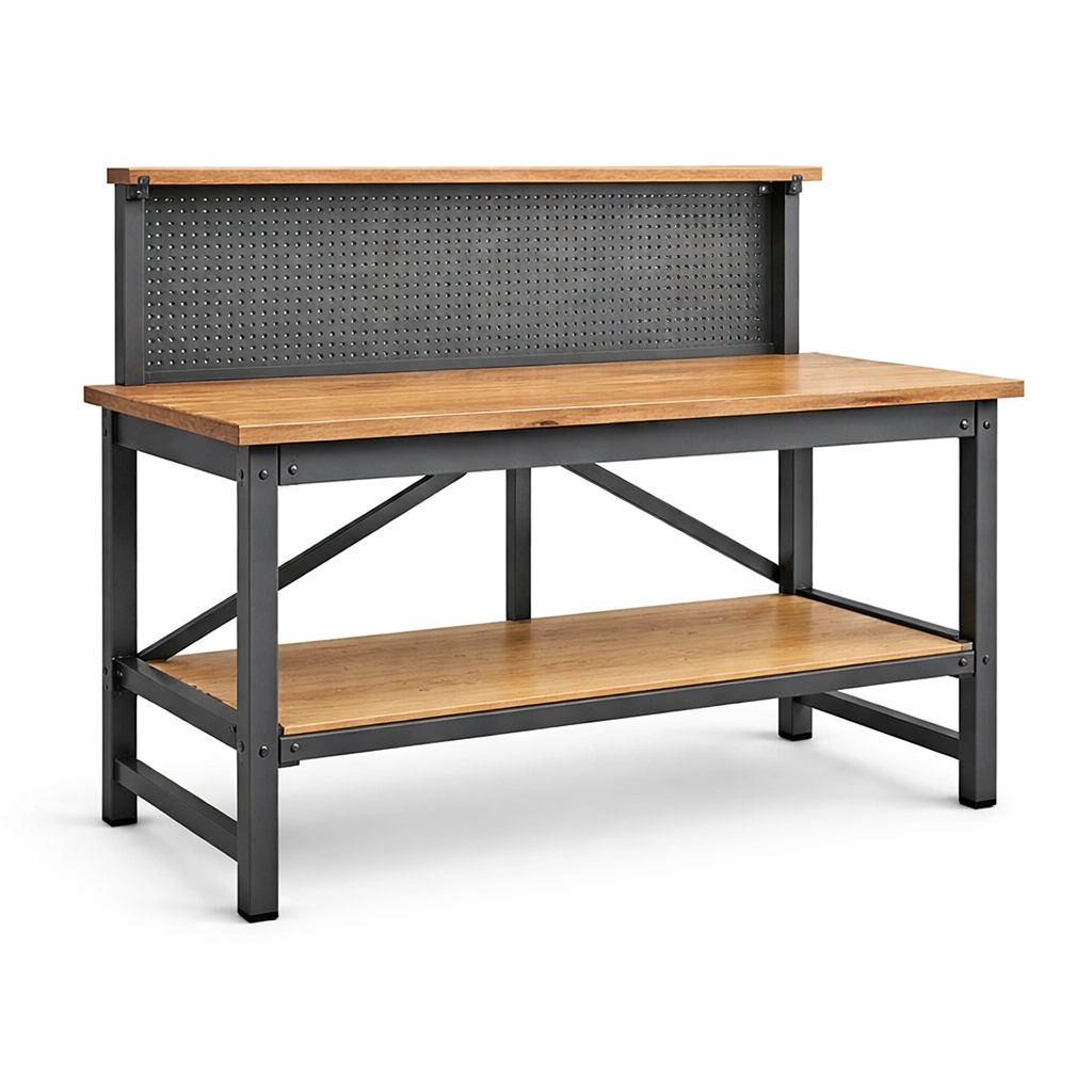 Tavolo da lavoro con piano in legno massello e struttura in acciaio.