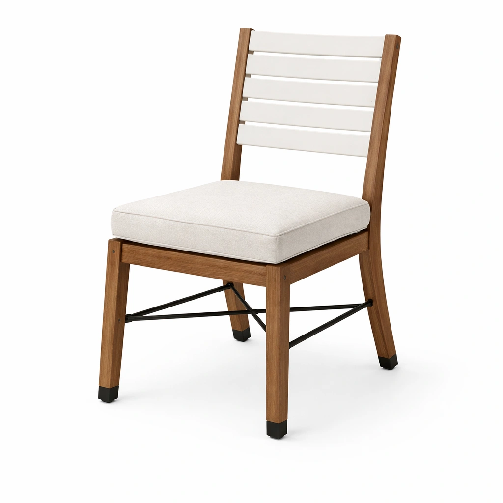 La sedia presenta una struttura in legno di acacia e metallo, con una seduta imbottita in schiuma e rivestita in tessuto di poliestere.