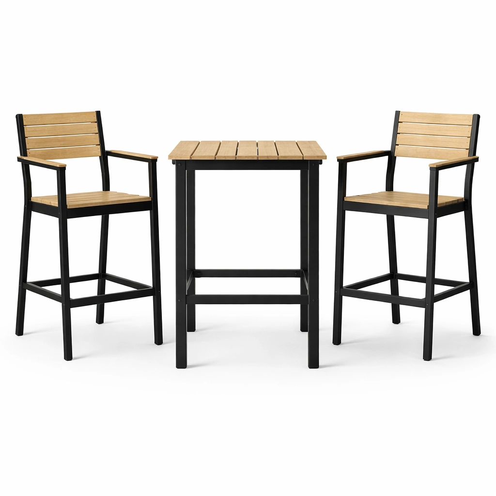 Set da bar composto da un tavolo e due sgabelli. La struttura è in metallo verniciato nero, mentre la seduta e il piano del tavolo sono in legno composito. Adatto per uso interno ed esterno.