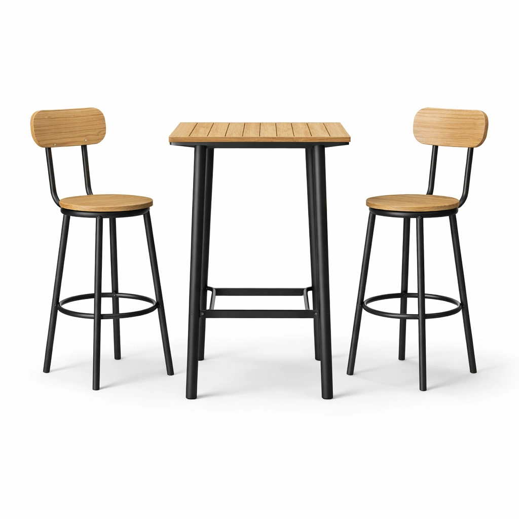 Il set comprende un tavolo alto rettangolare e due sgabelli.