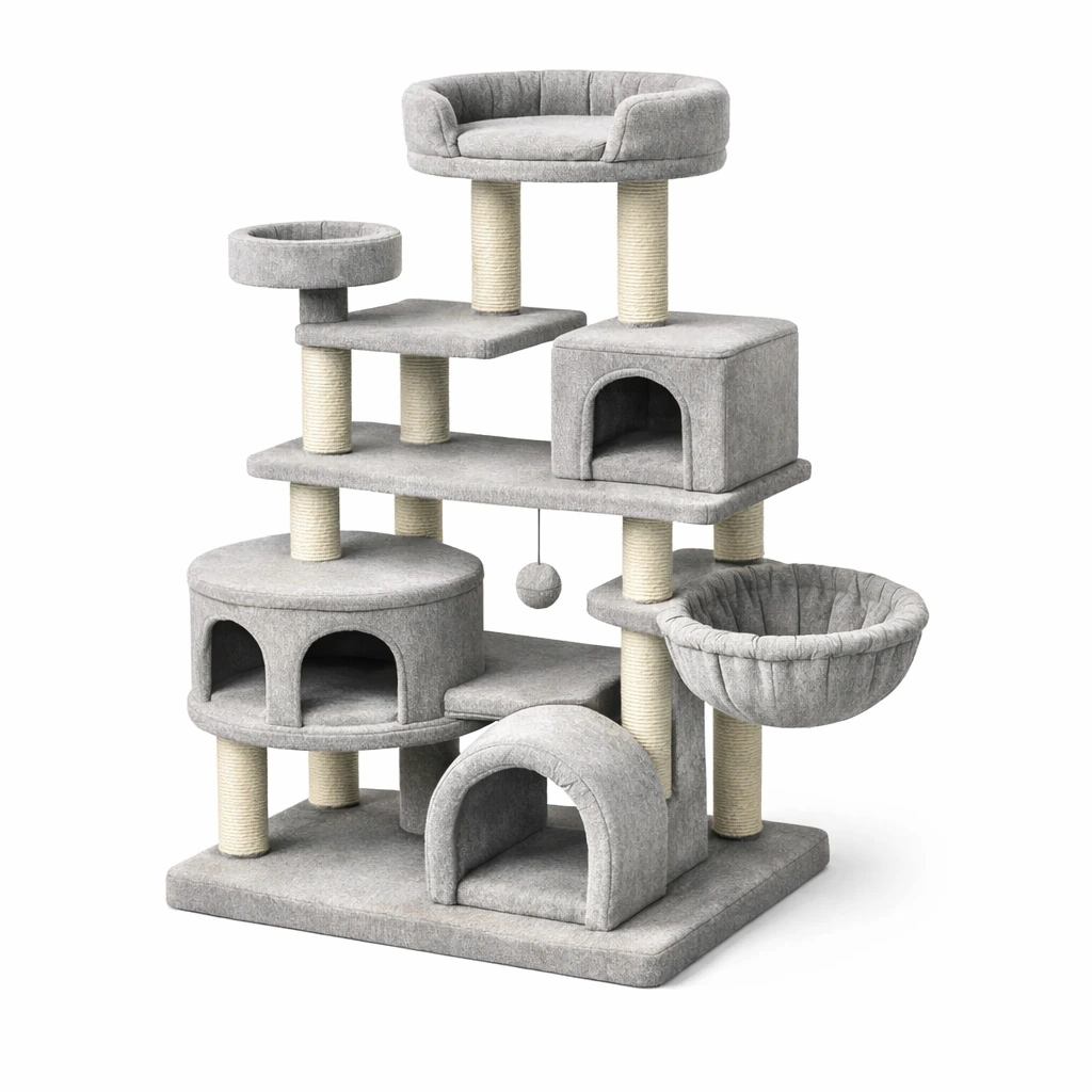 Questo albero tiragraffi per gatti è costituito da pannelli di legno rivestiti in tessuto grigio morbido e resistente. Le colonne sono rivestite in sisal naturale, permettendo ai gatti di affilare le unghie. La struttura multi-livello include nicchie, piattaforme e un'amaca, fornendo diverse aree di gioco e riposo. Adatto per gatti fino a 7 kg.
